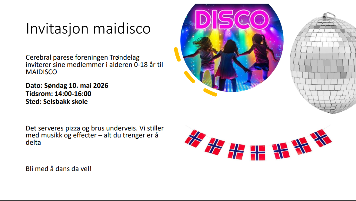 CP- Foreningen Trøndelag inviterer til Maidisco for Barne- og ungdomsgruppa (0-18 år)!