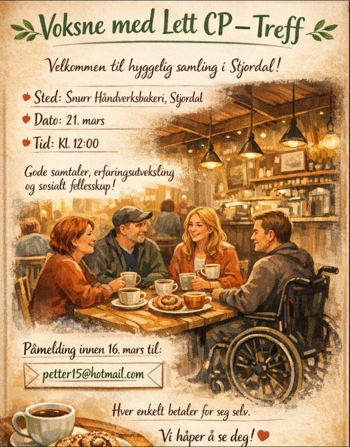 CP- Foreningen Trøndelag inviterer til: Voksne med lett CP-Treff på Snurr Håndverksbakeri på Stjørdal. Se invitasjon under.